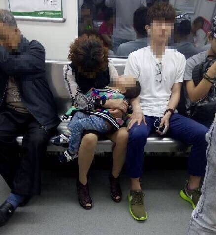 母子地铁睡着,邻座小伙借臂当枕,感人