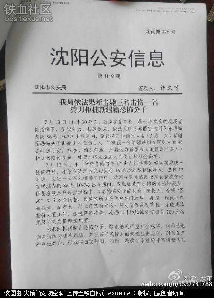微博截图沈阳市公安局通报:依法果断击毙三名击伤一名持刀拒捕新疆籍恐怖分子。东方网7月13日消息:7月13日下午,据多名网友微博称,辽宁省沈阳中街发生砍人事件,已有嫌疑人被特警击毙。图片来自微博据辽宁发布微博报道,今日下午,沈阳警方排查一出租屋时