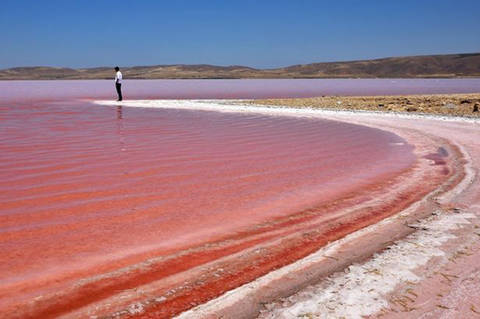土耳其阿克萨赖地区的盐湖图兹湖湖水呈现深红色国际在线专稿:据英国《镜报》7月18日报道,由于受到杜氏盐藻(Dunaliella salina)的影响,位于土耳其阿克萨赖(Aksaray)地区的盐湖图兹湖(Tuz Golu)变成红色,犹如一片红色